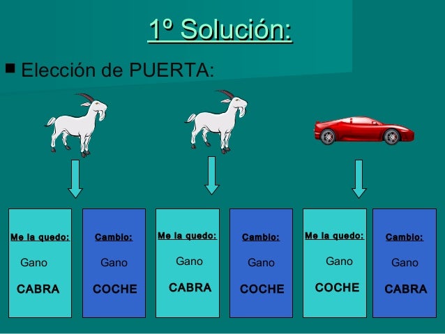 What is the matter here? Well we have 3 doors, two of which contain a goat and a third that has the prize: a car. We have the opportunity to select a door at the beginning. After this, the person in charge of the test, or the presenter of the program, opens one of the remaining doors showing one of the goats, at that moment it gives us the option of staying with the door we have chosen or changing it to the remaining door. According to the proposals regarding the solution of the problem, the correct strategy is always to change the door and not keep the one we had selected. Why is this? Well, the odds would be against us otherwise. Let’s consider: